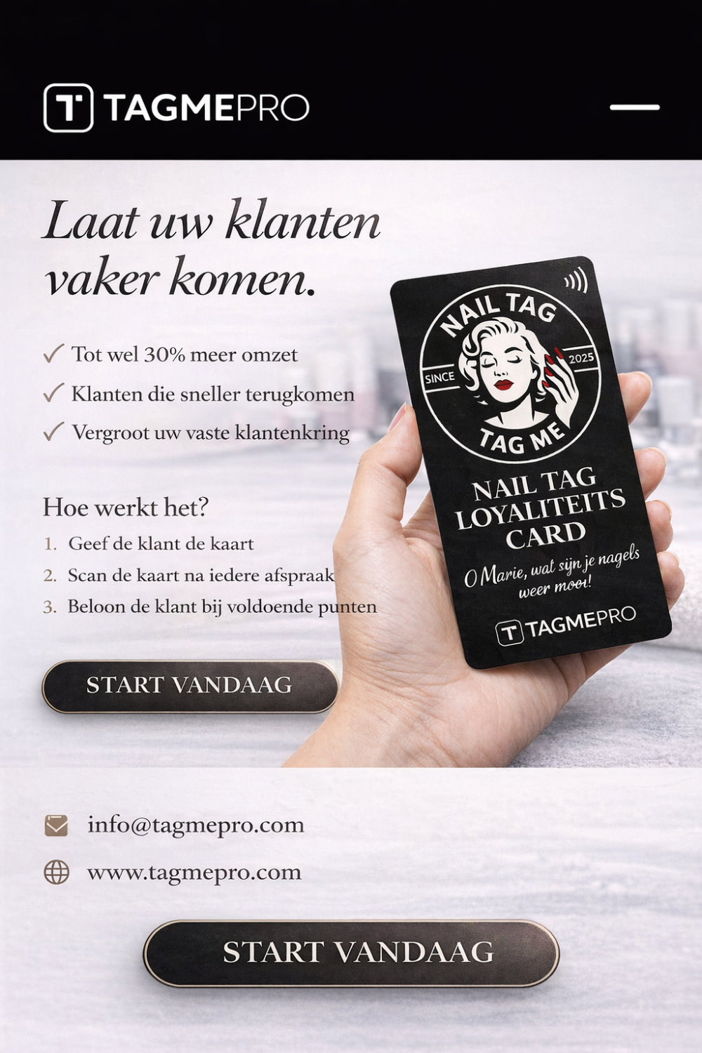 Stel u voor: elke klant in uw salon krijgt een persoonlijk kaartje met een unieke TagMe-code. Geen ingewikkelde systemen, geen gedoe met wachtwoorden of apps. Eén simpel kaartje, dat alles regelt.